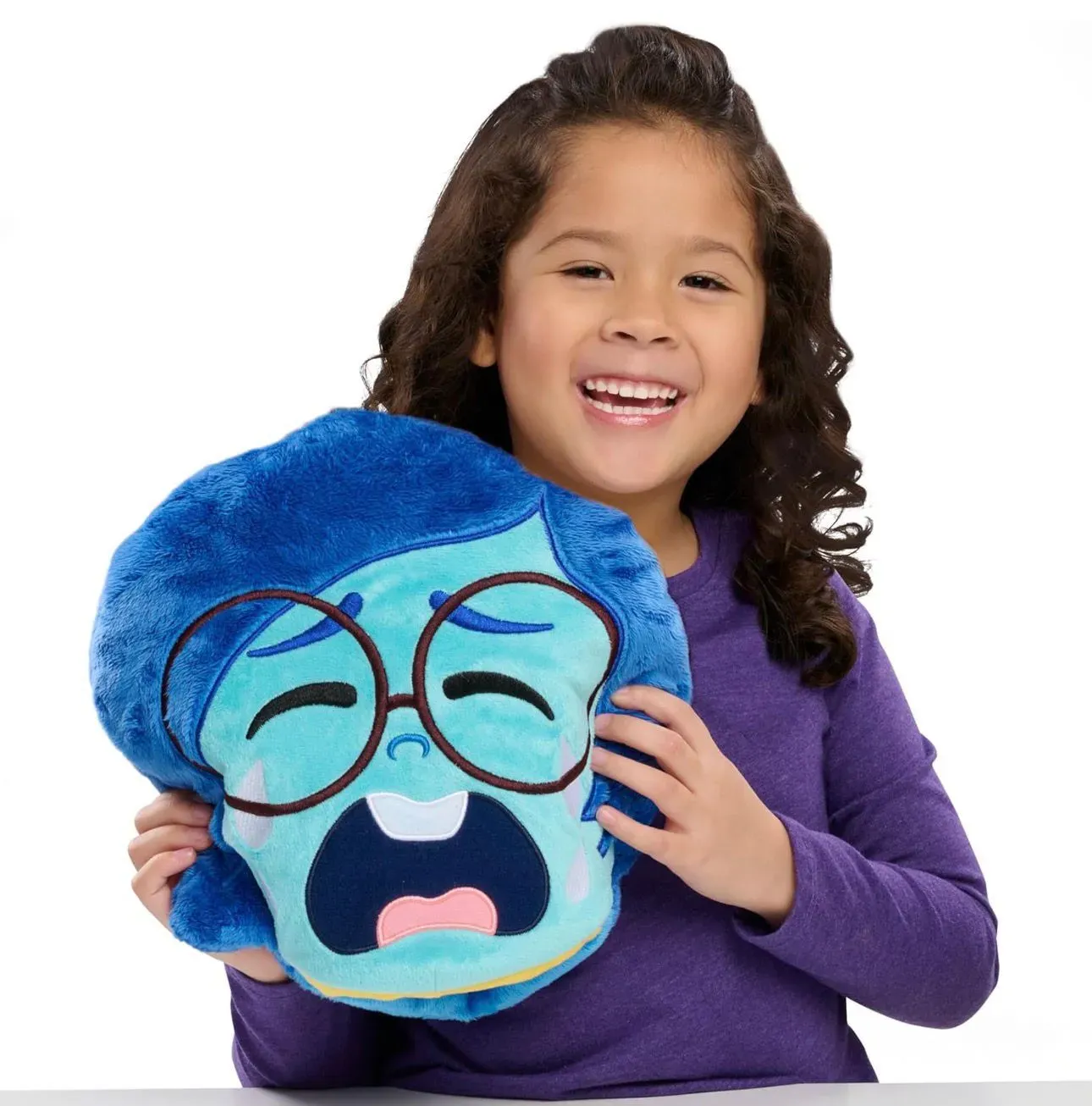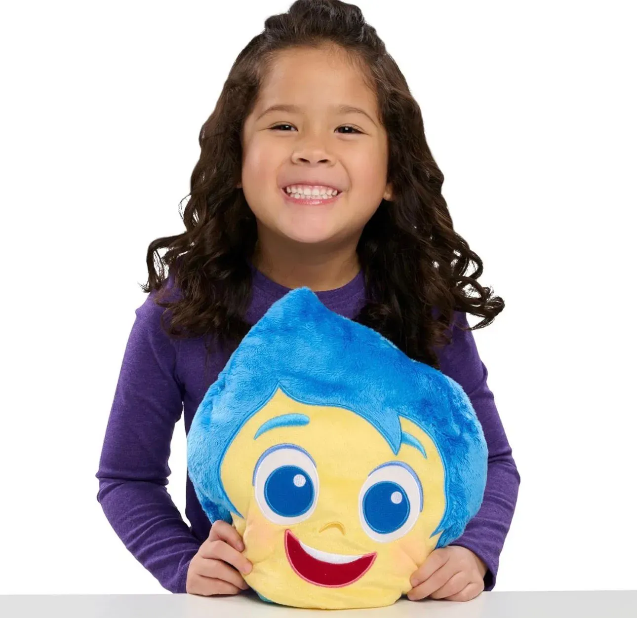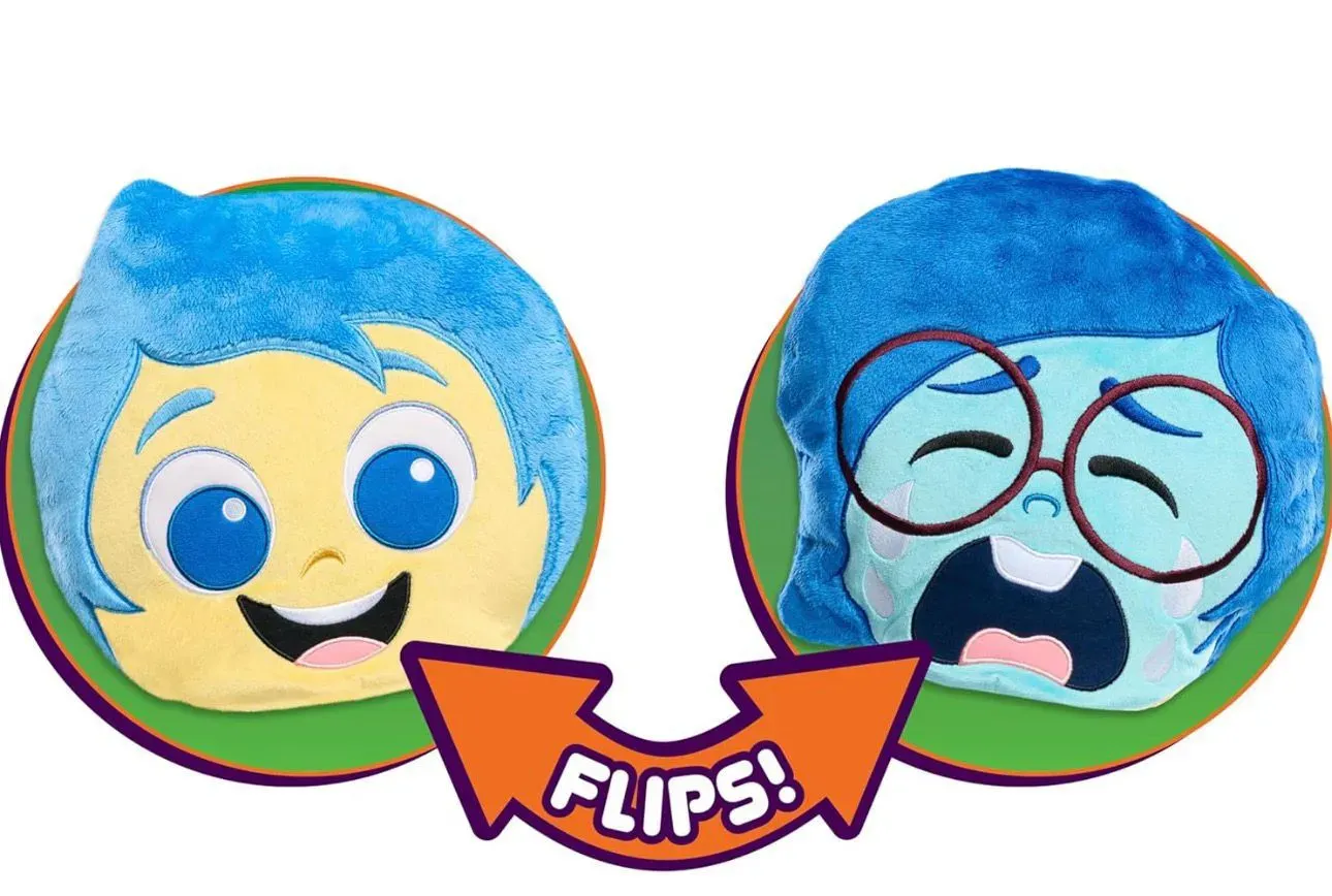 Este adorable cojín original de Inside Out 2 muestra a Alegría por un lado y Tristeza por el otro, con suaves materiales de felpa