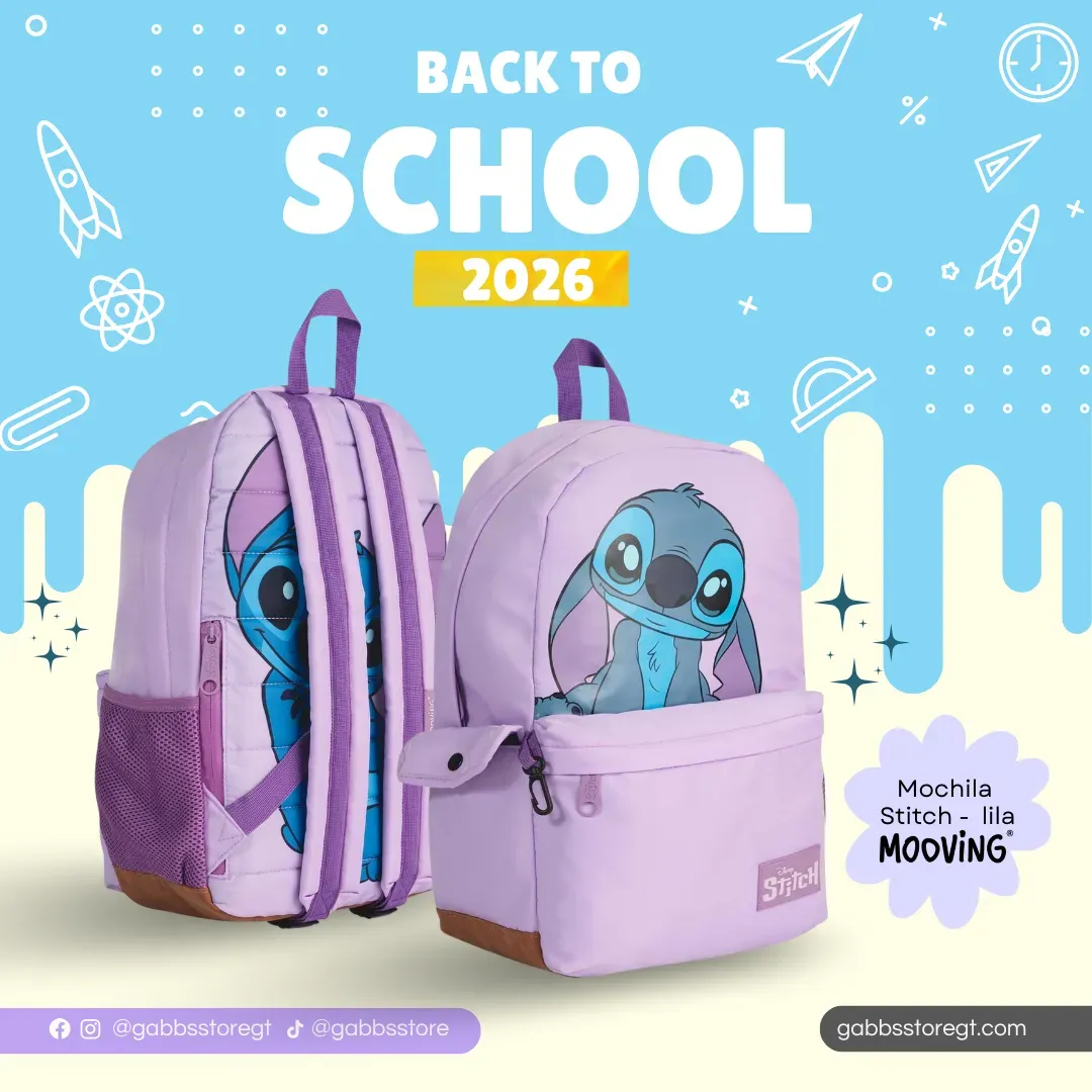 La mochila esencial en un encantador color lila. Con un diseño limpio y un gran protagonista en el centro, esta mochila te ofrece el espacio y la comodidad que necesitas con el toque travieso de Stitch. Es ideal para llevar todo lo necesario sin sacrificar el estilo.